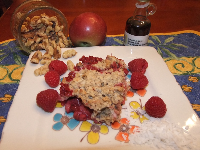 Janvier. Période pour manger santé et retrouver la forme. Ce crumble contient beaucoup de fibres et peu de matière grasse. Les framboises et pommes contiennent des sources de vitamines.