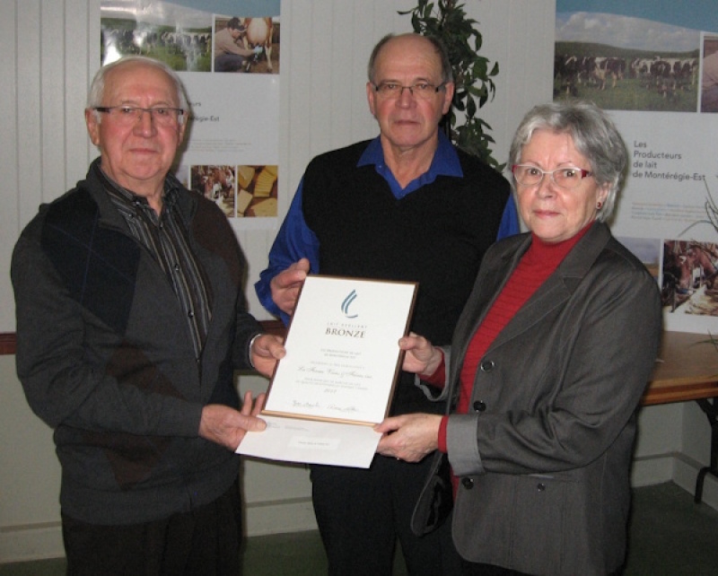 Médaille de bronze (Photo en bas) Ferme Viens et Frères de Saint-Alphonse-de-Granby Robert Beaudry, administrateur des producteurs de lait dans La Haute-Yamaska, est entouré d’André Viens et sa conjointe