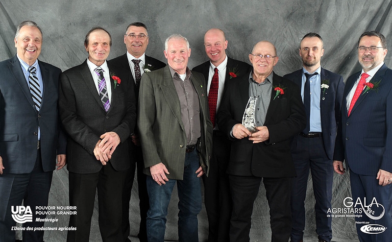 Serge Dethier (lauréat), Gérald Brouillard (lauréat) Sylvain Lefebvre (Kemin), Pierre Thibault (lauréat), Kirk Jackson (lauréat), Jean-Marc Ménard (lauréat), Yann Moal (Desjardins Entreprises) et Christian St-Jacques (UPA Montérégie)