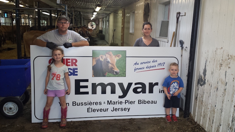 Je vous ai parlé de l’élégante vache Jersey de la ferme ÉMYAR INC. de St-Robert. Aujourd’hui je vous parlerai des entrepreneurs de la ferme, Yan Bussière et Marie-Pier Bibeau. Matin et soir nos deux complices font la traite d’un troupeau de vache de race Jersey. Le couple à deux jeunes enfants Émilie 4 ans et Arnaud 2 ans.