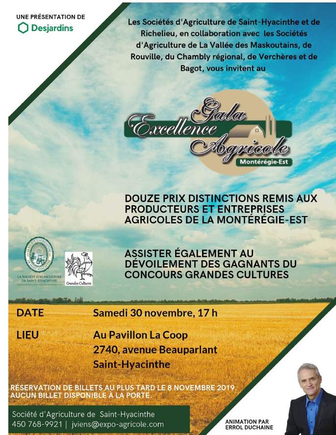 Saint-Hyacinthe, mercredi 2 octobre 2019 – Les Sociétés d’Agriculture de Saint-Hyacinthe et de Richelieu, en collaboration avec les Sociétés d’Agriculture de Rouville, du Chambly régional, de Verchères et de Bagot, sont fières de vous inviter en grand nombre au Gala Excellence Agricole 2019 présenté par Desjardins. Le 30 novembre prochain, nous récompenserons les entreprises, hommes et femmes se démarquant par leur profession au sein de diverses productions agricoles.