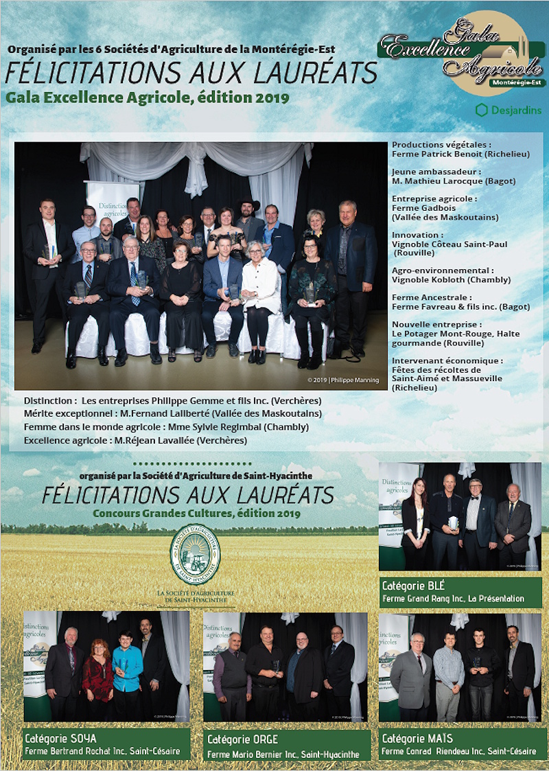 Les lauréats 2019 du Gala Excellence Agricole Montérégie - Est sont: