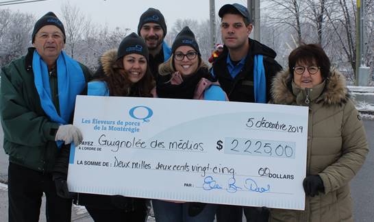 Saint-Hyacinthe, le 10 décembre 2019 — Le 5 décembre dernier, dans le cadre du Grand PARTAGE MASKOUTAIN de décembre, les Éleveurs de porcs de la Montérégie ont fièrement remis un don de 2 225 $ à Moisson Maskoutaine en plus de participer à la Guignolée des médias au coin du boulevard Laurier Est et de l’avenue Saint-Louis à Saint-Hyacinthe.