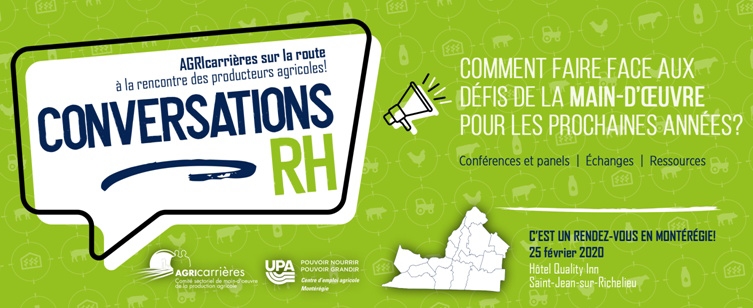 Avec la collaboration du Centre d’emploi agricole de la Fédération régionale de l’UPA de la Montérégie, l’événement Conversations RH Montérégie se tiendra le mardi 25 février 2020 à Saint-Jean-sur-Richelieu, à l’hôtel Quality Inn.
