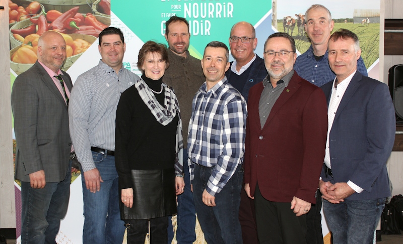 Derrière : Stéphane Bisaillon, président, Producteurs de grains Montérégie-Ouest / Steve Audet, directeur des finances chez Kemin / Luc Lussier, propriétaire des Fermes Lussier / François Nadeau, président des Éleveurs de porcs de la Montérégie / Eric Beauregard, président UPA Rivière Noire. Devant : Claire IsaBelle, députée d’Huntingdon / Jean-Claude Guérin, président UPA Jardins-de-Napierville / Christian St-Jacques, président UPA Montérégie / Réjean Racine, président, UPA Brome-Missisquoi