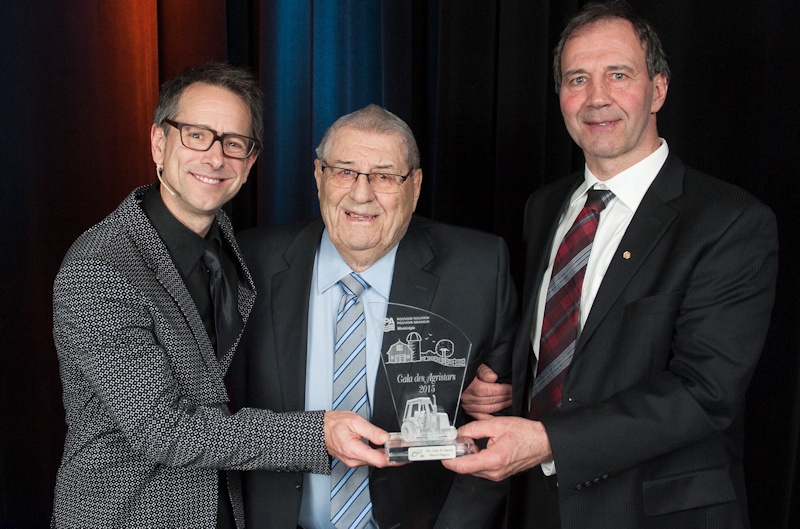 Monsieur Marcel Chagnon en 2015 lors de la remise du prix hommage / Coup de chapeau au Gala Agristars, entouré de Marc-André Coallier, animateur de l’événement et d’un commanditaire.