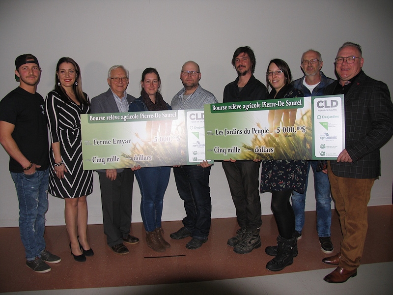 Renaud Beauchemin, président de la Relève agricole Richelieu-Yamaska, Lise Gauthier, conseillère jeunesse de la SADC Pierre-De Saurel, Gaétan Dutremble, président de la Caisse Desjardins Pierre-De Saurel, Marie-Pier Bibeau et Yan Bussières de la Ferme Emyar, Patrice Bertolacci et Jessika Labelle Bonaldo, Les Jardins du Peuple, Sylvain Joyal, président de l’UPA de Richelieu-Yamaska et Bertin Côté, président du CLD Pierre-De Saurel.
