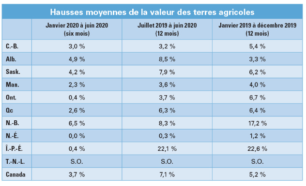 La valeur moyenne des terres agricoles à l’échelle nationale a grimpé de 3,7 % au cours de la première moitié de 2020. Cette hausse est similaire aux résultats de mi-année enregistrés depuis cinq ans, qui montrent des augmentations de moins de 10 % pour l’ensemble de l’année.