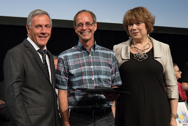 M. Richard Moisan, président du conseil d'administration de l'AQPC, M. Guy Raymond, professeur à l’ITA et récipiendaire d’une Mention d’honneur, ainsi que Mme Hélène David, ministre de l'Enseignement supérieur de la condition féminine. Crédit photo : Prince Dufort Production