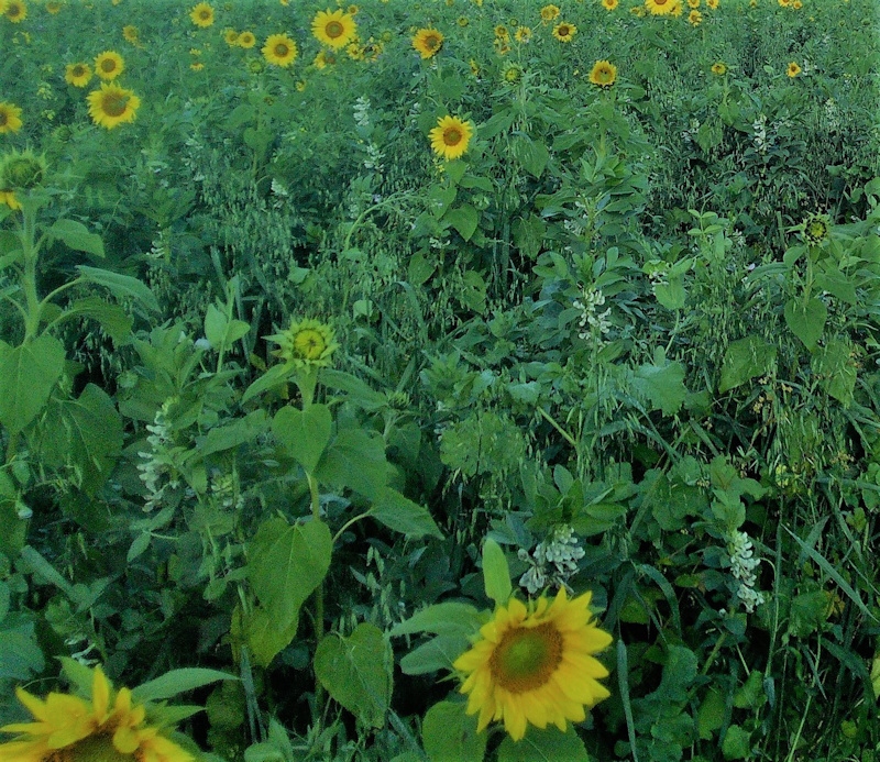 Parmi ses champs, on aperçoit une parcelle qui est constituée d’un mélange de plantes différentes ayant chacune une propriété distincte. « Le but, c’est de favoriser la captation d’azote dans le CO2 et produire le plus de carbone disponible et enrichir le sol en matières organiques par la décomposition progressive. »